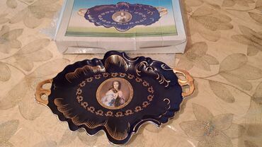 Rayonlara çatdırılmaÜnvandan götürməÇexiya istehsalı olan, kobalt rəngli, əl işi, zərif farfor qab. Qabın mərkəzində qızılı haşiyə ilə əhatə olunmuş portret təsviri var. Kənarları və tutacaqları qızılı rəngdədir. Dekorativ və ya praktik məqsədlər üçün istifadə edilə bilər. qedimidir antikvardir 40 ilin qabidir heç işlenmeyib öz karobkasindadir