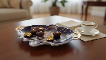 Mavi-qızılı 4 bölməli servis qabı - Material: keramik/porcelan tipli, parlaq kobalt-mavi rəng - Dekor: üzərində qızılı güllər və naxışlar, kənarlarda qızılı kontur - Forma: yarpaq siluetli, tutaca...