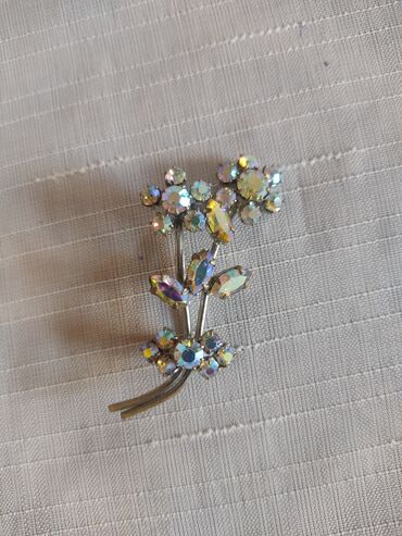 - Material: Gümüş rəngli metal əsas; çoxfasetli, iridescent (aura borealis effektli) şüşə/kristal daşlar.
