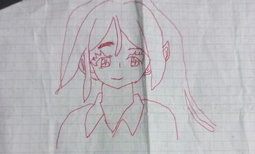 - Qırmızı gel/qələm ilə çəkilmiş, minimalistik kontur texnikasında anime portretləri.