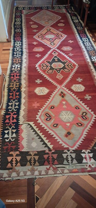Kilim xalça - Tip: Əl toxuması kilim - Material: Təbii yun iplik - Toxunma texnikası: İkiüzlü yastı toxunuş (kilim) - Ölçü: Təxminən böyük ölçülü (uzun düzbucaqlı), koridorda və ya qonaq otağında ...