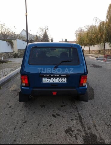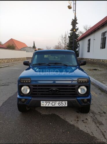 Lada Niva 4x4, mavi rəngli kuzov. Mexaniki sürətlər qutusu, daimi tam ötürücü. Salon qara dəri oturacaqlarla, ön mərkəzi dirsəklik və ikili stəkanlıqla təchiz olunub. Sükan çoxfunksiyalı deyil, lakin rahat tutuşa malikdir. Ön konsolda standart maqnitola/akustika yuvası, mexaniki iqlim idarəetməsi, idarəetmə düymələri və əlavə saxlama bölmələri mövcuddur. Döşəmə rezin xalçalarla qorunur. Qapı kartlarında akustik dinamika üçün yerlər var. Xaricdə: modernizə edilmiş LED tipli üst far blokları, orijinal dairəvi əsas faralar, plastik qoruyucu bamperlər, arxa şüşə üçün tək silecek, arxa duman işığı, palçıq qoruyucuları. Niva loqolu eşik qoruyucuları və 4x4 yazıları. Plitəli diskli ehtiyat təkər yeri kuzovun arxasında. Şəhər və yolsuzluq üçün klassik, etibarlı 4x4 konfiqurasiyası.