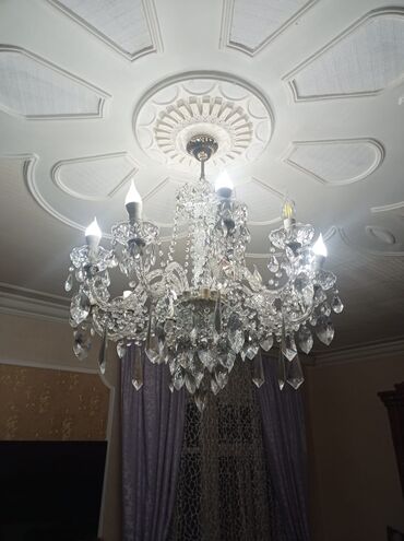Şüşə-kristal tavan lampası (plasfon) - Forma: dairəvi, yarı-qapalı tavan tipli - Material: parlaq xrom rəngli korpus, kəsimli kristal elementlər və şüşə bəzəklər - Dizayn: ağ fon üzərində qızılı ç...
