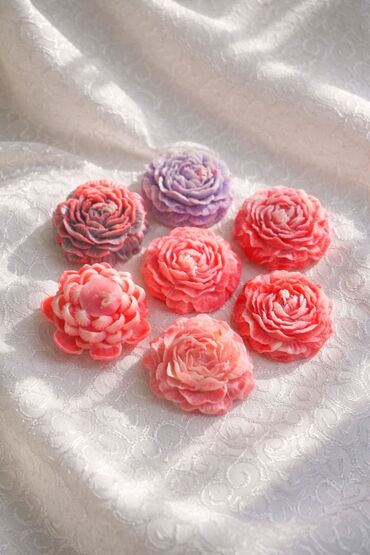 Əl işi çiçək formalı şamlar - Material: yüksək keyfiyyətli parafin/soya qarışığı, pambıq fitil - Dizayn: pion, ranunkulus və lotus üslublu çoxqatlı ləçək effektli dekorativ şamlar - Rənglər: çəhra...