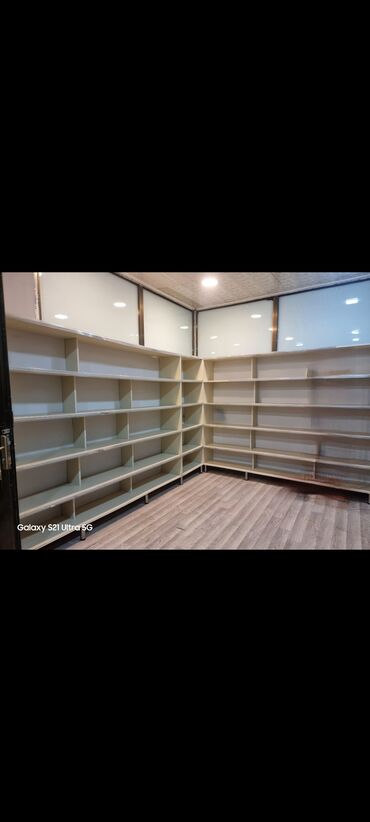 - Komplekt: L formalı divar boyu modul rəflər və ayrıca kiçik kassaya/masaya uyğun 2 rəfli stend