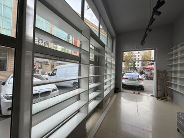 - Ön vitrin hissəsində şüşə fasada paralel yerləşən vitrin rəfləri, mağaza üçün ideal