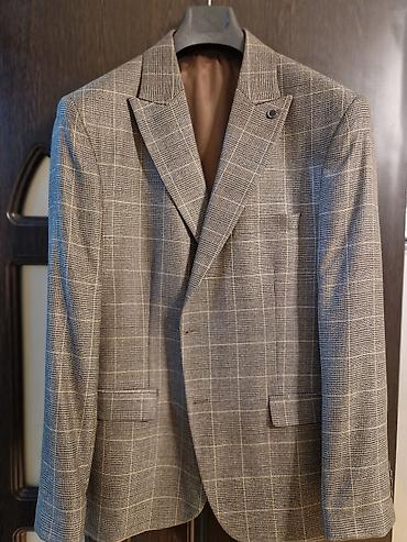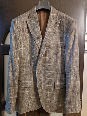 Kişi üçün klassik jaket – Maro&Ti markası - Rəng: tünd boz, xırda balıqqulağı teksturası və incə qəhvəyi xətli dama naxışı - Model: bir sıralı, 1 düyməli; nizamlı (classic/slim arası) kəsim - Yaxa...