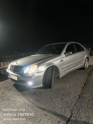 Mercedes-Benz C‑Class sedan (W203) – gümüşü rəng. Xarici: - Gümüş metalik kuzov - Orijinal 5 qol ulduz dizaynlı yüngül lehimli disklər - Qara radiator barmaqlığı və ön emblem - Tündləşdirilmiş arx...
