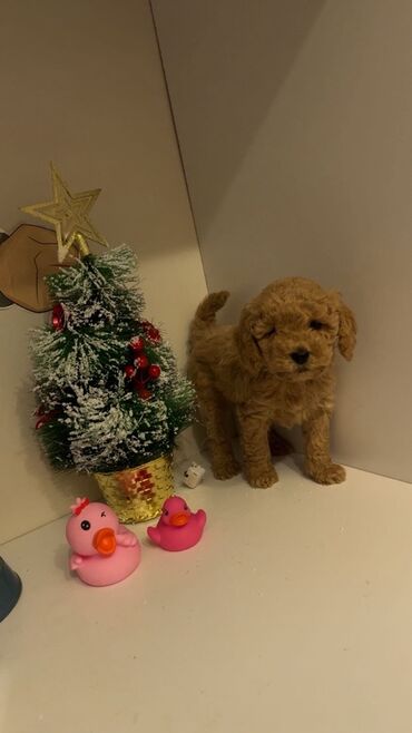 Mini toy pudel balası - Cins: Toy/Mini Poodle - Rəng: Açıq qızılı/abrikos - Xüsusiyyətlər: Hipoallergen yun (tük tökmür, qoxu saxlamır), yumşaq qıvırcıq tük örtüyü, kiçik ölçülü bədən quruluşu, ağ...