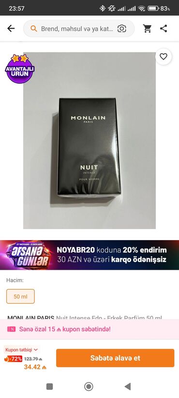 İmza qara dizaynlı, gecə temalı, intensiv kişilər üçün ətir. Şəhər üslubunu və klassik tərzi vurğulayan dərin, qalıcı kompozisiya. Hədiyyəlik təqdimata uyğun. Məhsul Gəncə şəhərindədir. Hal hazırda Trendyolda kuponlar və endirimlərlə 37-40 azn arasıdır. Mən 2 dənə almışdım deyə birini satıram 33 azn. Halbuki öz qiyməti çox bahadır. Qoxusu əladır. Kim istəsə gəlsin probniki var qoxlasın xoşuna gəlsə alsın. Alan peşman olmaz əsl oliqarx ətirdir.