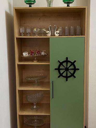 - Dizayn: açıq rəfli vitrin + sağ tərəfdə qapılı bölmə. Qapıda dekorativ sükan formalı aplik, qapı rəngi zeytun-yaşıl