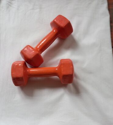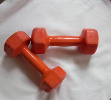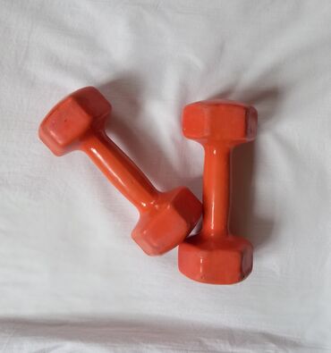 Cüt halda olan qırmızı rəngli 5 kq-lıq dumbbelllər. Bu dumbbelllər altıbucaqlı formalı başlara malikdir və yerə qoyulduqda yuvarlanmasının qarşısını alır. İdman zalında və ya evdə istifadə üçün uyğ...