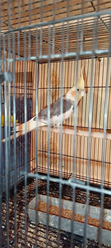 Nimfa tutuquşu (Cockatiel) - Növ: Nimfa tutuquşu, xarakterik sarı toqqa (çəngə) və yanaqlarda açıq narıncı ləkələr - Rəng: Boz-gövdə, qanad və quyruqda krem/sarı naxışlar, baş və xəzəl bölgədə pa...
