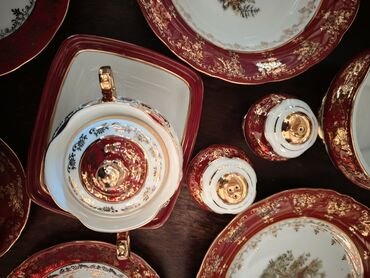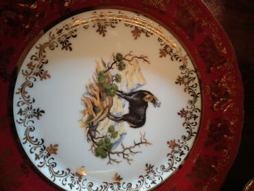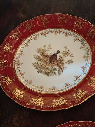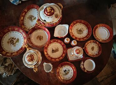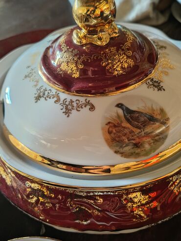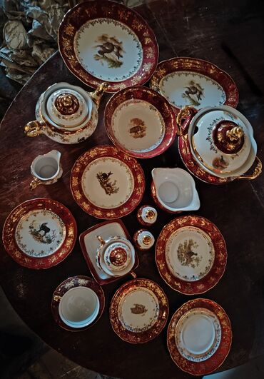 Salam əleykə yemək və çay sevisidir hər bir şeyi tam yerindədir heç bir dəfə belə istifadə olunmayıb qiymətdə endirim olar wp aktivdir. Qırmızı və qızılı dekorlu, ov səhnələri və meşə quşları/heyvan illüstrasiyaları ilə bəzədilmiş porselen süfrə dəsti.
