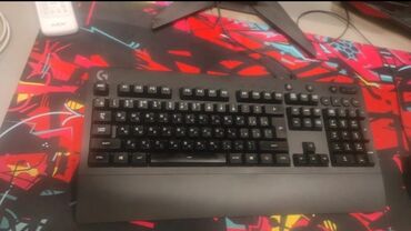 - Klaviatura: Logitech G seriyası tam ölçülü mexaniki/gaming üslubunda klaviatura. Tam F1–F12 sıra, ayrıca ox düymələri və rəqəmsal blok. Üst hissədə media idarəetmə düymələri var. Qara korpus, Azərbaycan/Rus dil işarələməsi olan düymələr (kiril simvolları görünür). USB ilə qoşulur, kabelli vezyeti ela.
