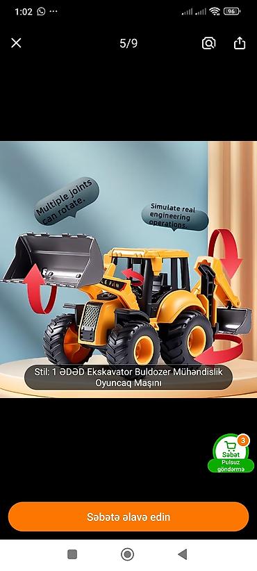 - Növ: 2 funksiyalı tikinti maşını oyuncağı (öndə buldozer kovası, arxada ekskavator qolu)
