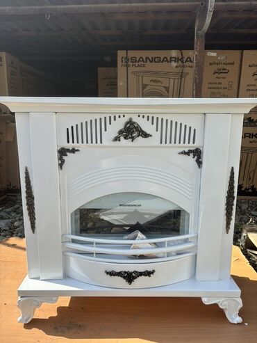 Dekorativ klassik dizaynlı elektrik sobası/şömine. Gümüşü rəng, relyefli naxışlar və arkalı dekor panel ilə. Ön hissədə qoruyucu barmaqlıq, yan tərəfdə idarəetmə düymələri. Şüşə ön paneldə Behkaran...