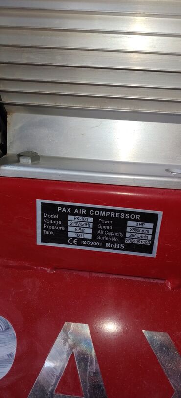 PAX Air Compressor – PK-100 model - Güc: 3 HP - Gərginlik: 220V / 50Hz - Maks. təzyiq: 8 bar - Qəbul (hava məhsuldarlığı): 250 L/dəq - Mühərrik sürəti: 2800 r/min - Qab (tank həcmi): 100 L - Serti...