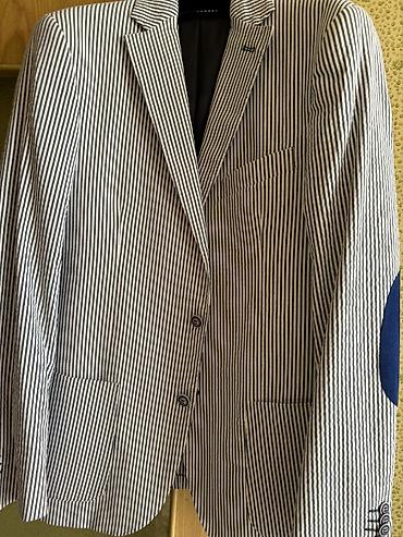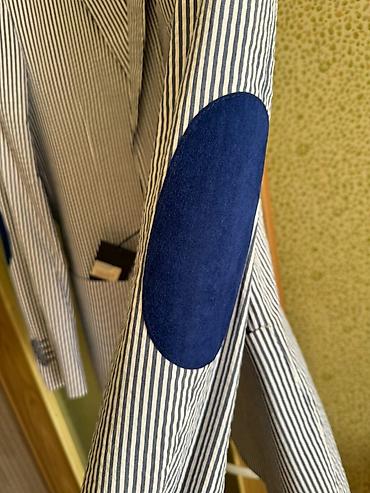 Ölçü etiketində konkret ölçü görünmür; fotolardan kəsim orta ölçü seqmentinə uyğundur. Zolaqlı dizayn fiquru vizual olaraq uzadır, tünd mavi dirsək yamaları isə həm funksional, həm də vurğu detalı kimi önə çıxır.