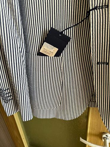 - Rəng və naxış: Ağ–tünd mavi incə şaquli zolaqlar