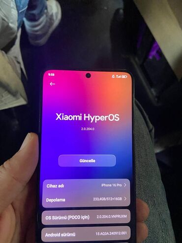 POCO X6 – Xiaomi HyperOS ilə Texniki xüsusiyyətlər: - Model: POCO X6 (ekranda “Cihaz adı: Poco X6”) - OS: Xiaomi HyperOS, versiya 2.0.205.0 (POCO üçün) - Android versiyası: 15 (güvənlik yenilənməs...Giriş•Qeydiyyat