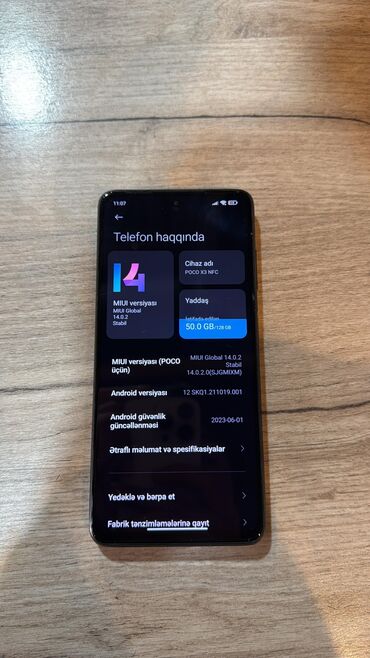 POCO X3 NFC – mavi rəng - Ekran: Ön tərəfdə mərkəzi punch‑hole kameralı böyük ekran - Sistem: MIUI Global 14.0.2 (stabil), Android 12 - Yaddaş: 128 GB daxili yaddaşdan 22.1 GB istifadə olunub - NF...