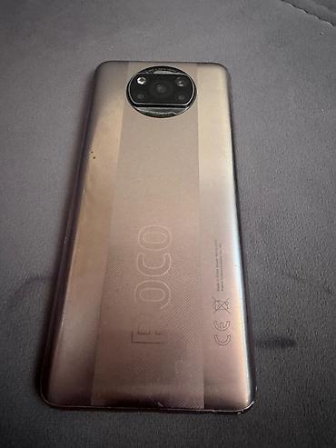 POCO smartfon - Model: POCO X3 (arxa hissədə böyük “POCO” loqosu və dairəvi kamera modulu) - Rəng: tünd qızılı/bronza tonlarda - Kamera sistemi: dairəvi modulda çoxlu kamera və LED flaş; üst hissə...