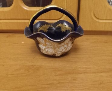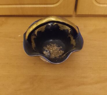 Zərif dekorativ porselen şirniyyat/cem qabı - Material: porselen (parlaq şirəli səth) - Rəng: tünd lacivərt - Bəzək: mərkəzdə qızılı çiçək naxışı, kənarlarda incə qızılı ornamentlər və qızılı kəna...