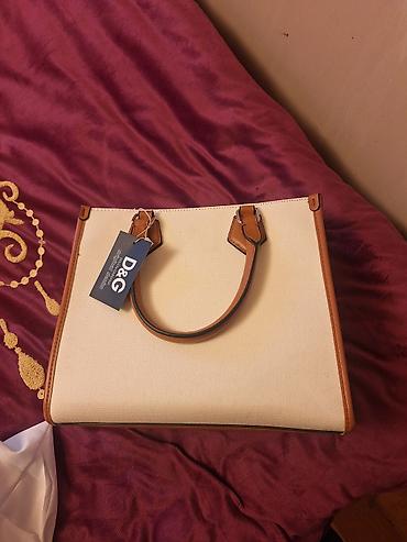 - Material: sıx toxumalı bej kanvas korpus, konyak rəngli eko-dəri/deri detallar və kənarlar