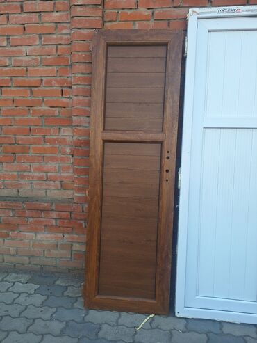 - Dizayn: iki bölməli panel görünüşü, aşağı-yuxarı şaquli/lamelli naxış; standart menteşe və tutacaq/asma kilid üçün deşiklər hazırdır