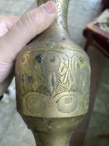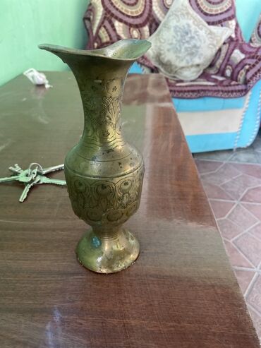 Naxışlı bürünc və ya misdən hazırlanmış, detallı dizaynı olan dekorativ vaza. Bu vaza qızılı və mis tonlarında rəngləri özündə birləşdirir, üzərində mürəkkəb oyma və ya relyef naxışlar var. Uzun və...
