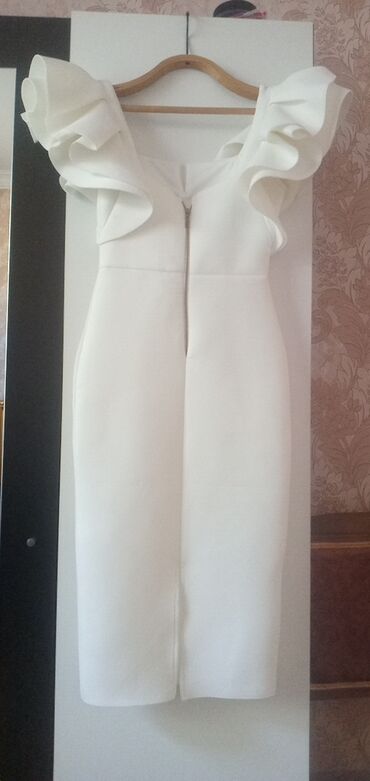 Ağ rəngli, bədənə oturan midi don, qısa qolları qat-qat büzməli