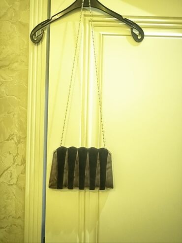 Qadın çanta və aksesuar dəsti 1) Qızılı zəncirli qara-şokolad tonlarında axşam çantası - Material: məxmər/velür görünüşlü parçalar kombinasiyası - Dizayn: yelpikvari panellər, sərt formalı korpus ...