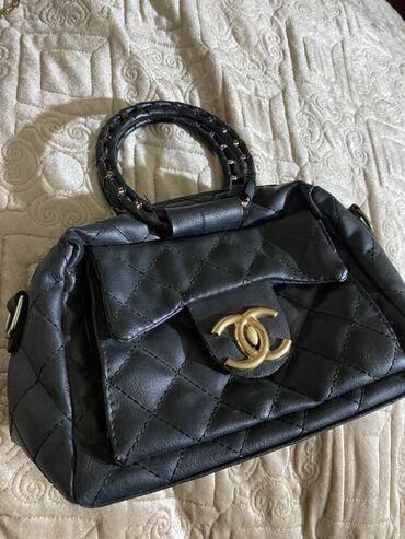 2) Qara, kvadrat tikişli (quilting) əl çantası. Halqavari saplar, ön qapaq, qapaqda qızılı tonlu dekorativ CC tipli kilid elementi. Yanlarda qayış bəndləri mövcuddur.