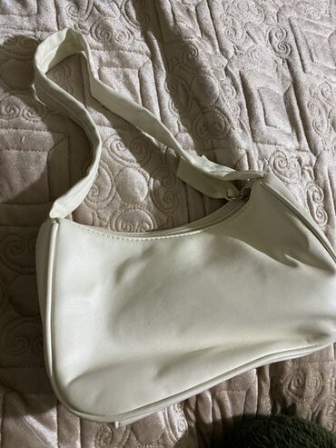 3) Açıq krem-ağ tonunda minimal dizaynlı çiyin çantası. Yuxarı hissədə fermuarlı bağlanma, geniş və yumşaq qayış.