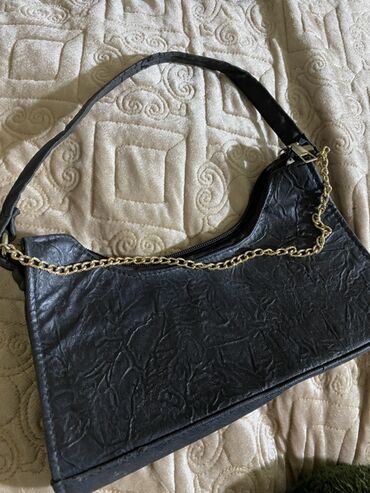 4) Qara, büzməli/kreş teksturalı çiyin çantası. Üst hissədə fermuar, dekorativ qızılı rəngli zəncir detalı və qayış üzərində toka.