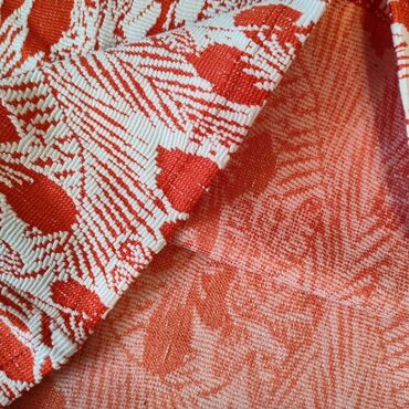 - Rəng və naxış: narıncı-ağ jacquard tropik/bitki motivli parça