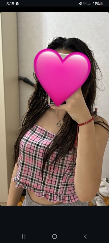 - Pambıq/plyuş toxumalı iki hissəli dəst: açıq çəhrayı rəng, nazik qayışlı crop top və elastik belli enli şalvar. Şəkildə qiymət və ölçülər: 20 AZN (S, M, L).
