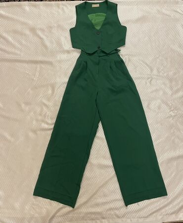 Yaşıl iki hissəli qadın dəsti: - Üst: Klassik krujka kəsimli, V-yaxa, ön hissədə iki böyük düymə ilə bağlanan qolsuz jilet. Yanlarda dekorativ ciblər xətti, iç hissəsi açıq yaşıl astarlıdır. - Aşağ...