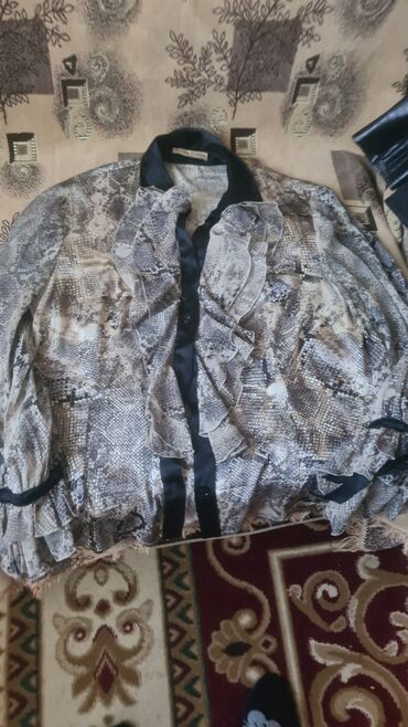 Brend: Elisa Fanti Qadınlar üçün şık bluz. - Naxış: ilan dərisi (snake print) motivli, bej-qara-boz tonlarda. - Detallar: ön hissədə qat-qat volanlar, parlaq atlas effektli qara yaxa və ön planşet...