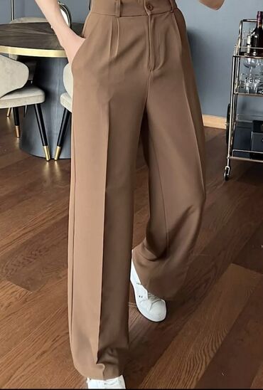 - Şalvar: yüksək bel, düyməli və fermuarlı qapanma, yan ciblər, ön qat tikişləri ilə enli-paça (wide-leg) kəsim. Həm idman ayaqqabısı, həm də klassik ayaqqabı ilə rahat kombinə olunur.
