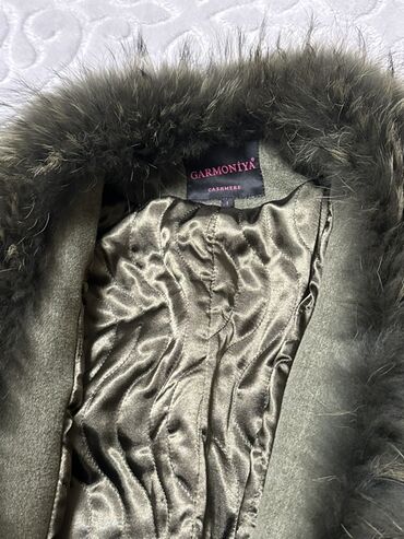 GARMONIYA qadın palto – kaşmir - Brend: GARMONIYA (etiketdə “Cashmere” qeyd olunub) - Ölçü: 38 - Material: kaşmir tərkibli parça, iç hissədə yumşaq, parıltılı/kapitone toxumalı detal - Rəng: isti ...