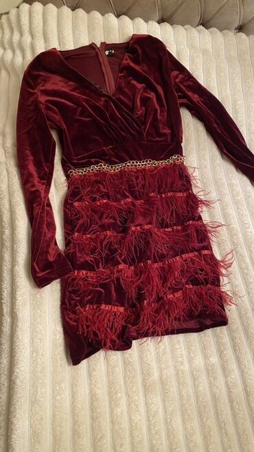 Bordo məxmər qısa geyim - Material: yumşaq məxmər - Rəng: dərin bordo/şərab ton - Dizayn: V-şəkilli dekolte, uzun qollar, bel hissəsində dekorativ qızılı zəncir - Etek hissəsi: qat-qat tük/franj b...
