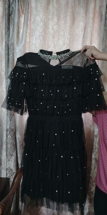 - Dizayn: tam boy boyunca kaskad volanlar; tülün üzərində səpələnmiş dekorativ inci muncuqlar
