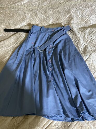 - Model 3: Mavi düyməli ətək. Ön hissədə dekorativ düymələr, uyğun parça kəməri ilə birlikdə. Yüngül parça, A-kəsim siluet.
