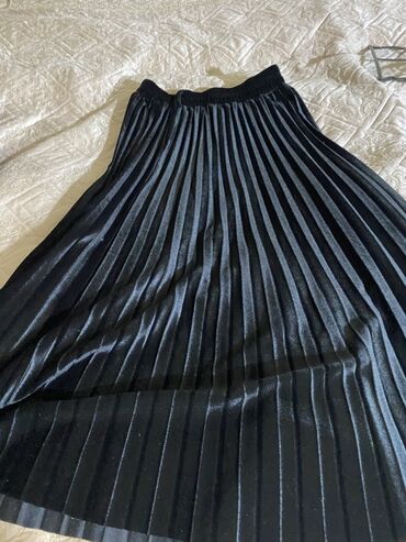 - Model 2: Qara pliseli ətək. Dizə yaxın uzunluq, elastik bel. Parlaq fakturalı material sayəsində klassik və şık görünüş yaradır.