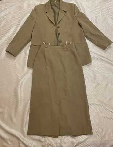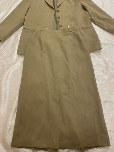Qadınlar üçün üçlü kostyum dəsti - Rəng: zeytun-yaşıl - Tərkib: 3 hissədən ibarət dəst – jaket, yubka və iç köynək/top - Jaket: beldən oturan kəsim, ön hissədə dekorativ bəzəklər, manjetli qollar,...
