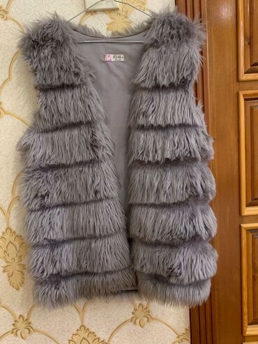 3) Süni kürk jilet – boz rəngdə, pilləli (qat-qat) tekstura, yumşaq tüklü səth. Daxili astarlı, açıq önlü model, gündəlik və ya payız-qış kombinlərinə uyğun.