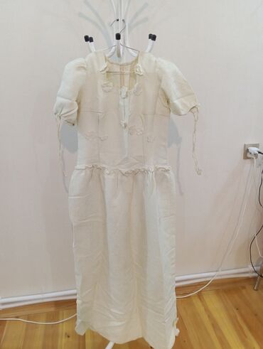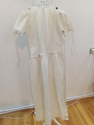 Bej rəngli uzun paltar - Brend/etiket: REYON - Bədən: M ölçü - Material hissiyatı: nazik, yüngül və hava keçirən toxuma (yay üçün ideal) - Dizayn: kvadrat-açıq yaxa, ön hissədə düymələr, arxada tə...