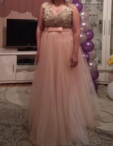 Zərif axşam/gecə geyimi - Rəng: Pudra-şaftalı tonlarında - Parça: Atlas əsas + şifon/tül üst qat - Dizayn: Üst hissə və ətəyə doğru sıxlığı azalan şəkildə incə muncuq və strazlarla əl işçiliyi bəz...